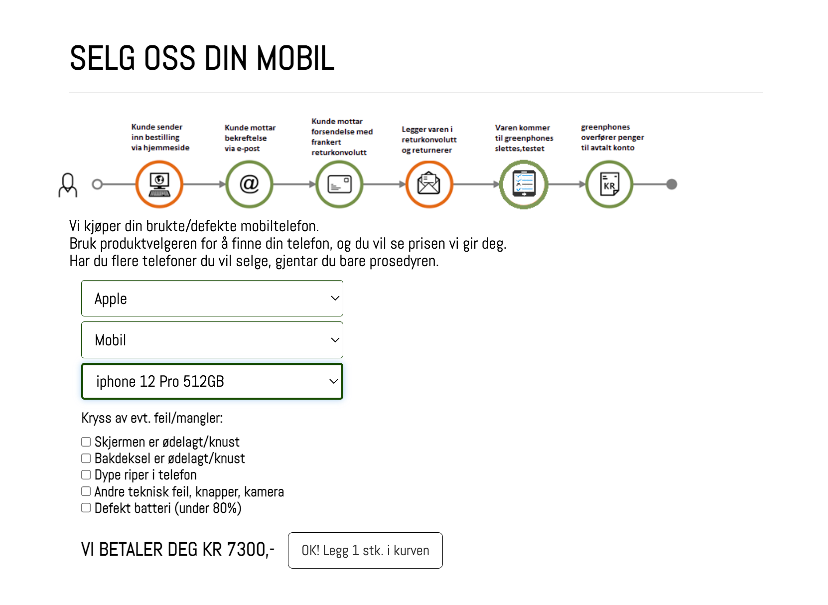 I produktvelgeren skriver du inn modellnavnet på din mobil og fyller ut skjema. Deretter sender vi deg en gratis returkonvolutt du kan bruke for å sende oss mobiltelefonen.